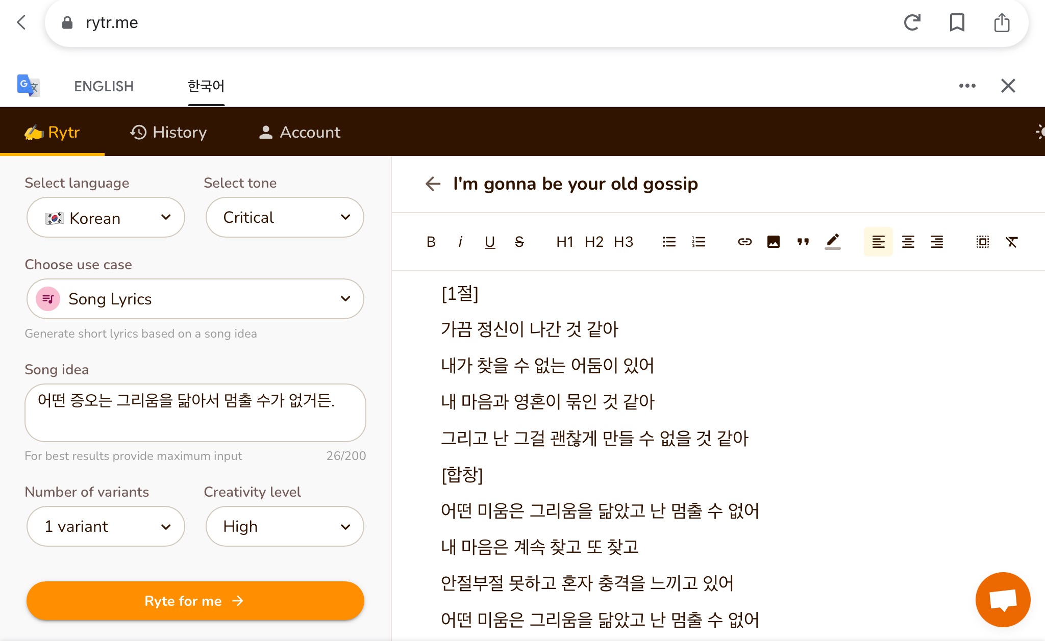 내가 원하는 주제로 작사를 하고 싶다면 AI로 생성 후 다듬어서 써도 좋을 것 같다.