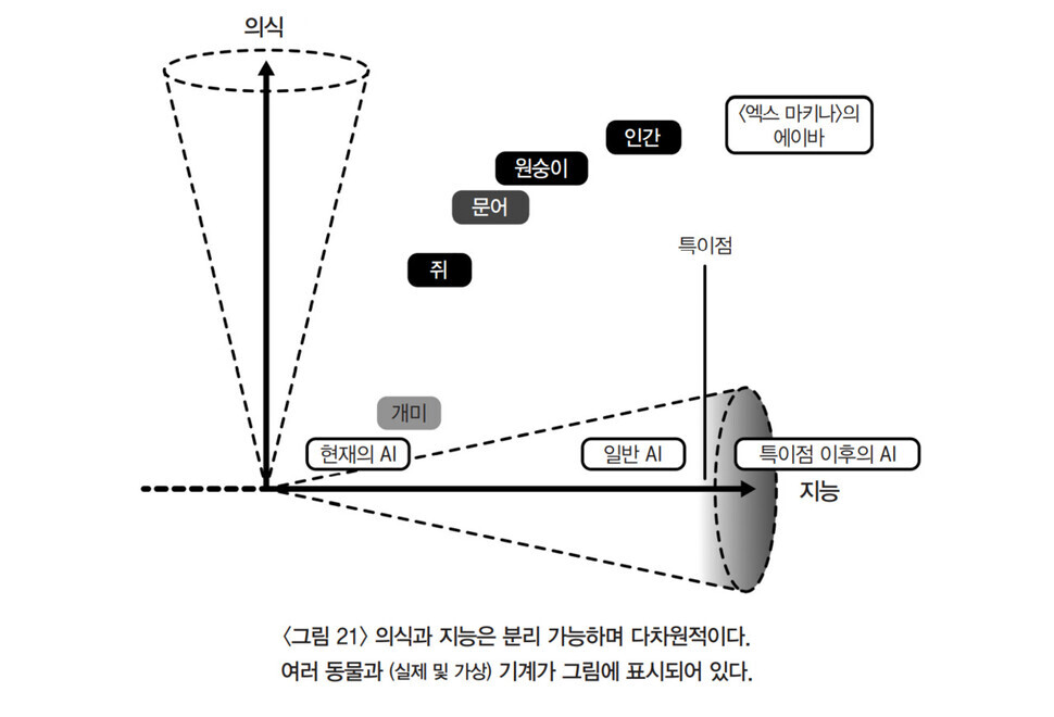 또한, 지능이 많지 않아도 의식이 존재할 수 있을 뿐만 아니라, 역으로 지능도 의식 없이 존재할 수 있음을 알 수 있었다.